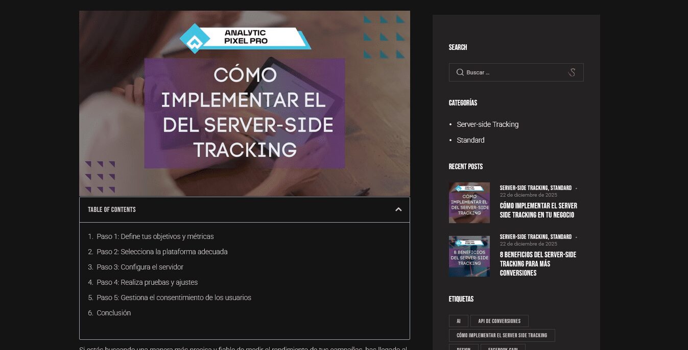 Para el SEO, nos hemos enfocado en optimizar su sitio web mediante una estructura sólida, investigación de palabras clave relevantes y la implementación de técnicas avanzadas para mejorar el posicionamiento en los motores de búsqueda. Nuestro objetivo fue aumentar la visibilidad y atraer tráfico cualificado, asegurando que Analytic Pixel Pro se destaque frente a la competencia en su industria. Esto incluyó la optimización de contenido, la mejora de la velocidad de carga del sitio y la creación de enlaces de calidad, todo con el fin de generar una mayor conversión de visitantes en clientes potenciales.
